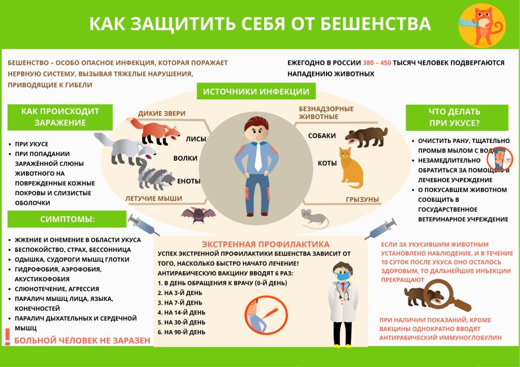 Важно знать, что вирус — возбудитель бешенства, может находиться в слюне больного животного за 10 дней до появления видимых признаков заболевания. Попадая в организм человека, вирус распространяется по нервным путям, достигает головного мозга, где развивается воспаление, нарушающее работу жизненно-важных элементов центральной нервной системы, следствием чего становится смерть. Предотвратить бешенство можно при помощи вакцинопрофилактики и соблюдении правил поведения при контакте с дикими и безнадзорными животными.